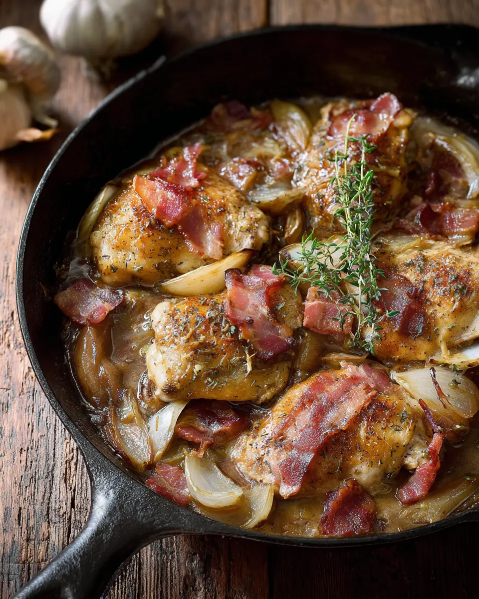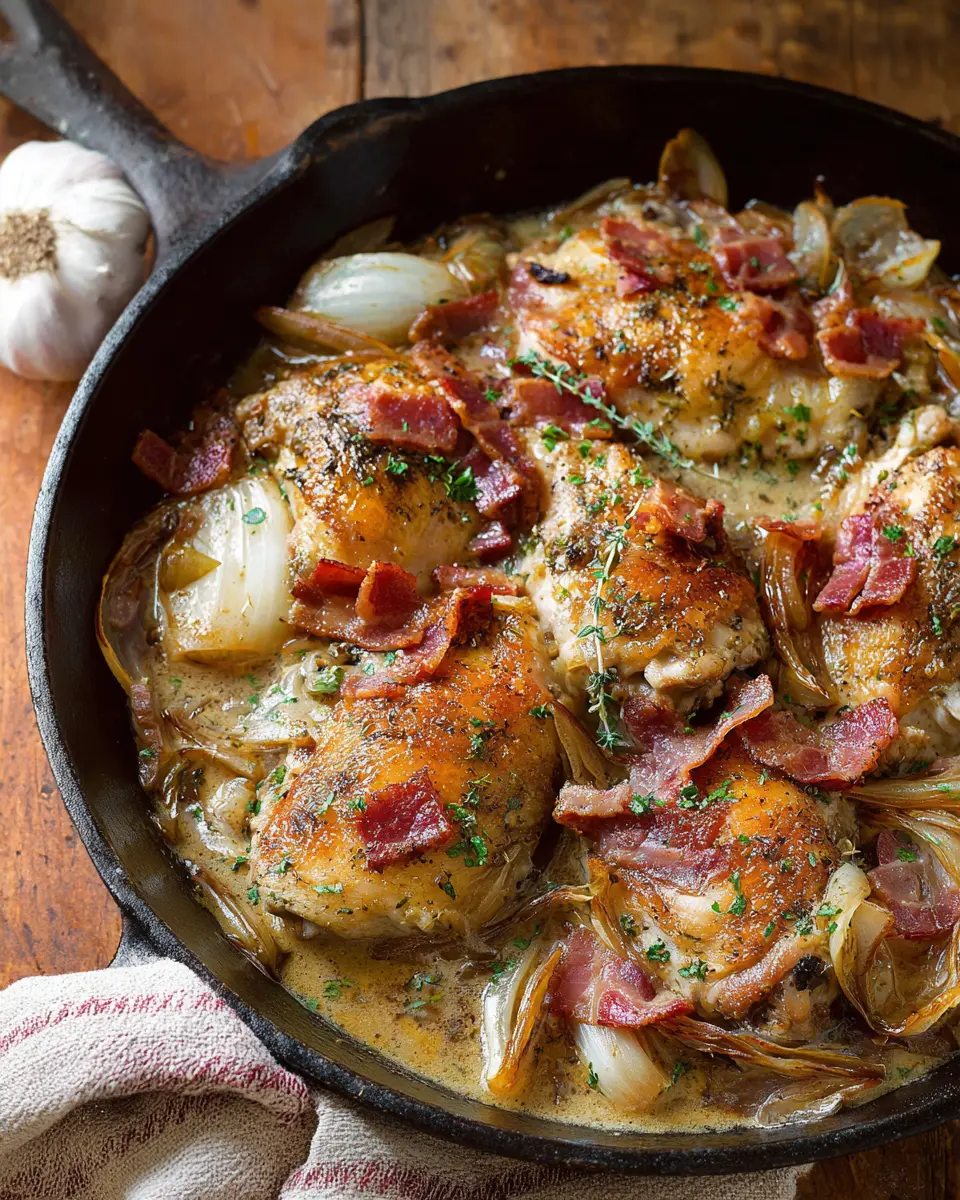 Introduction to Chicken Fricassée with Shallots and Turkey Bacon