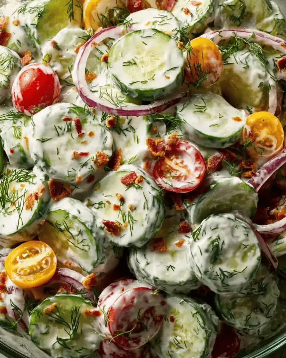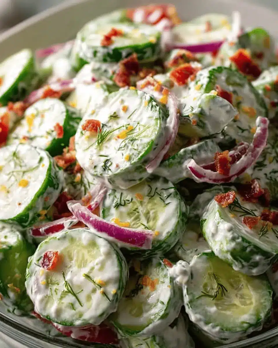 - In a large bowl, combine sliced cucumbers, shredded cheddar, crumbled bacon, red onion, and dill.
