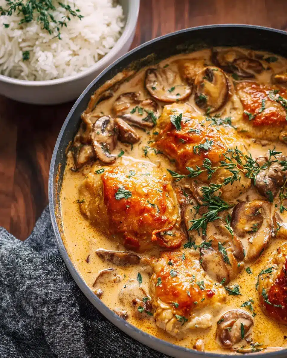 In a large, heavy-bottomed skillet, drizzle about 1 tablespoon of oil and heat it over medium-high. When the pan is hot (you can test it by flicking a few drops of water onto the pan—if they sizzle, it’s ready), carefully add the chicken thighs, skin side down. Sear them for about 3 minutes on each side until they develop a golden brown crust. This step seals in those delicious juices and creates layers of flavor that are crucial for your sauce later. Once done, remove them from the pan and set aside.