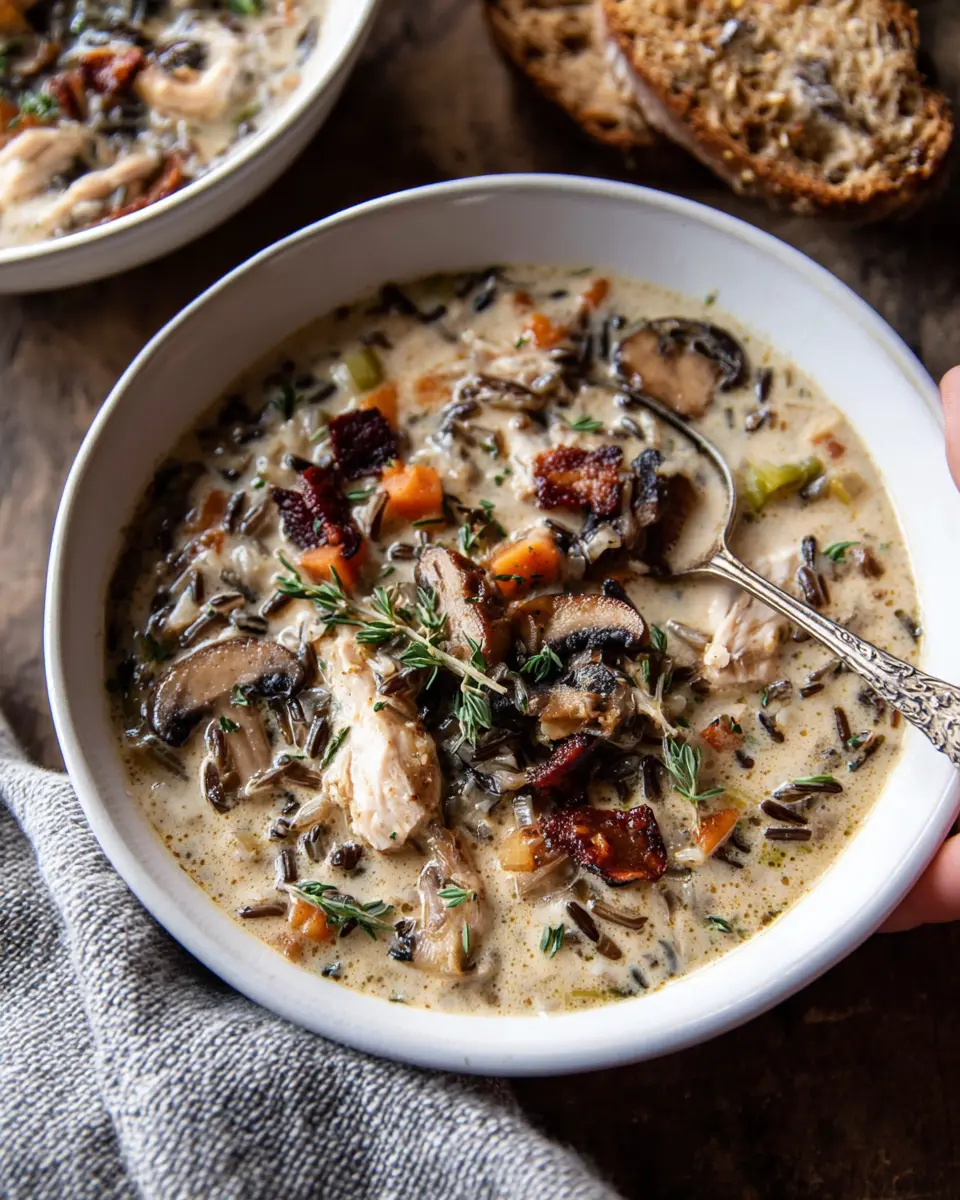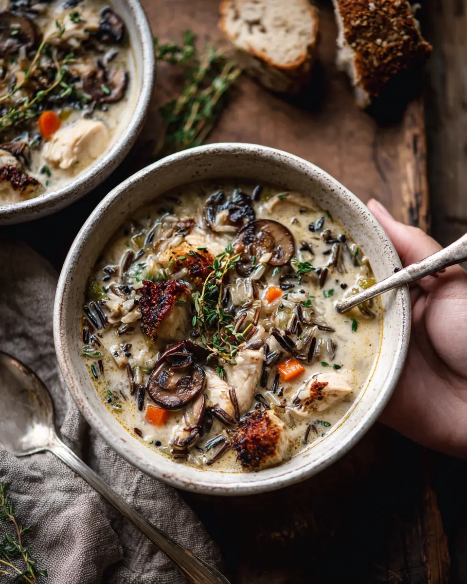 Creamy Wild Rice Chicken Soup with Roasted Mushrooms.
