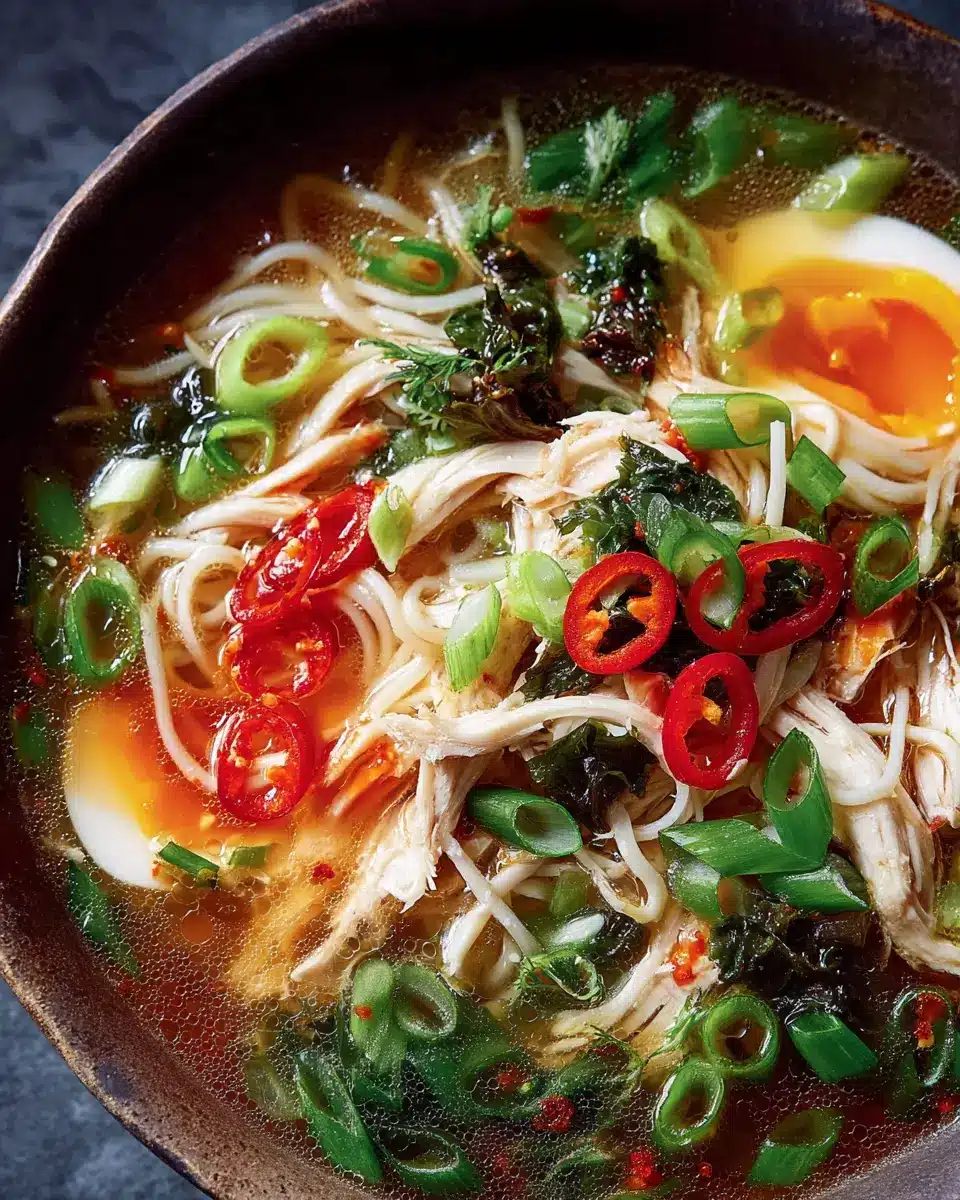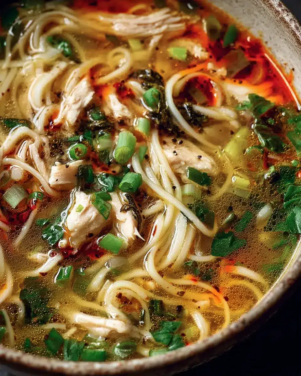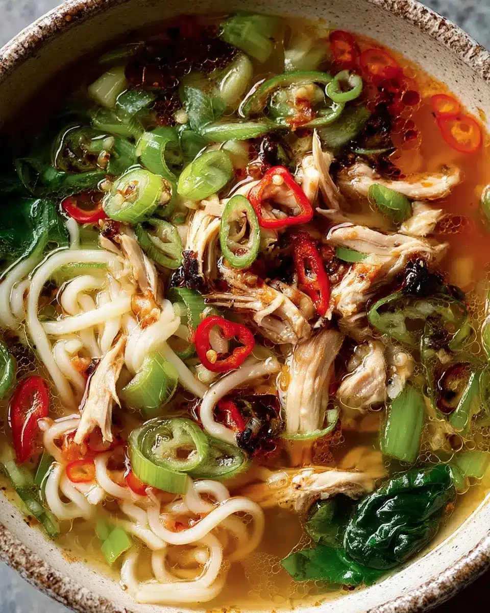 Now comes the exciting part! Divide the delicious soup among bowls, ensuring each bowl has a generous amount of noodles, chicken, and aromatic broth. Top each serving with a handful of the reserved scallion greens. Drizzle in about a tablespoon of your soy sauce mixture for a flavor boost, and allow everyone to customize with additional chili oil if they wish.