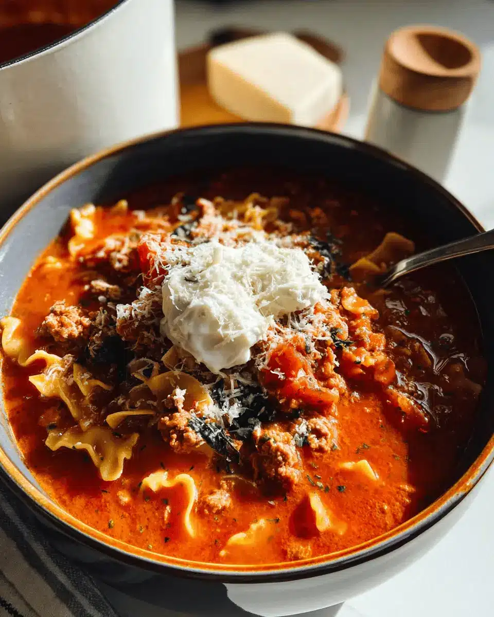 Feel free to customize the spice profile of your lasagna soup to match your taste. If you enjoy a bit of heat, add a pinch of red pepper flakes or some diced jalapeños. For a smoky flavor, consider incorporating smoked paprika. Want something milder? You might replace the Italian seasoning with a bit of oregano or simply adjust the amounts to suit your palate. Experimenting with seasonings not only enhances your dish but makes it uniquely yours!