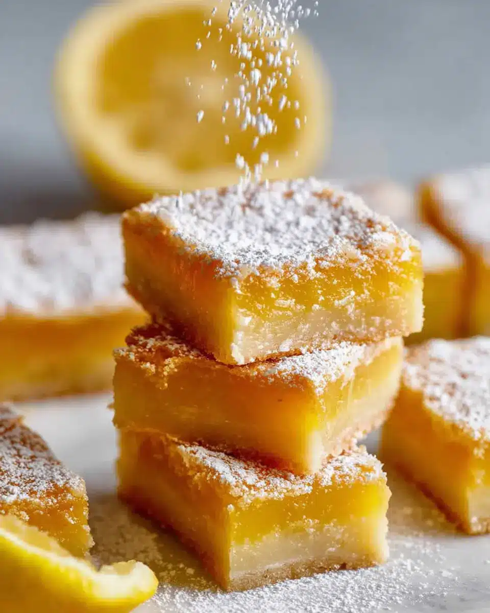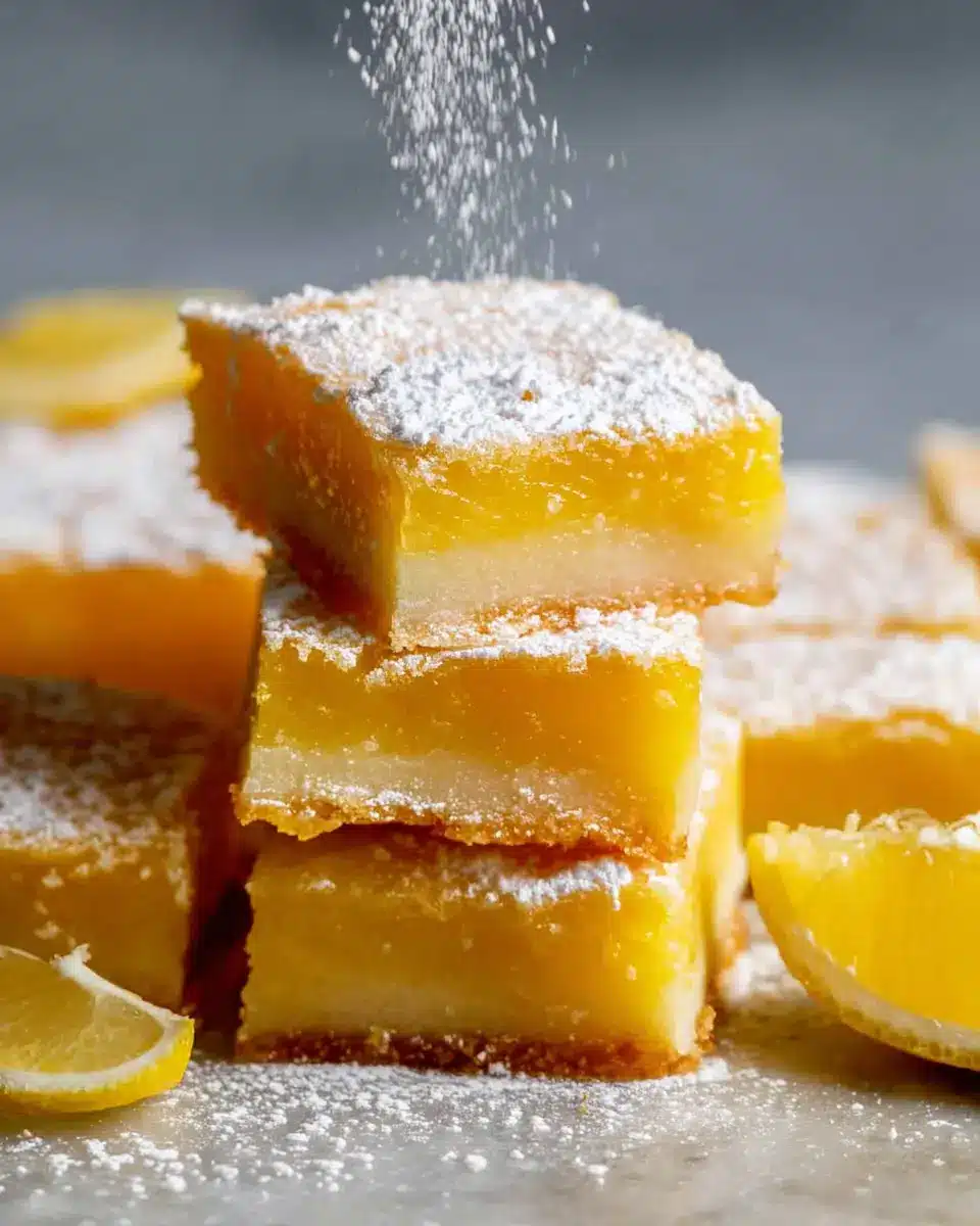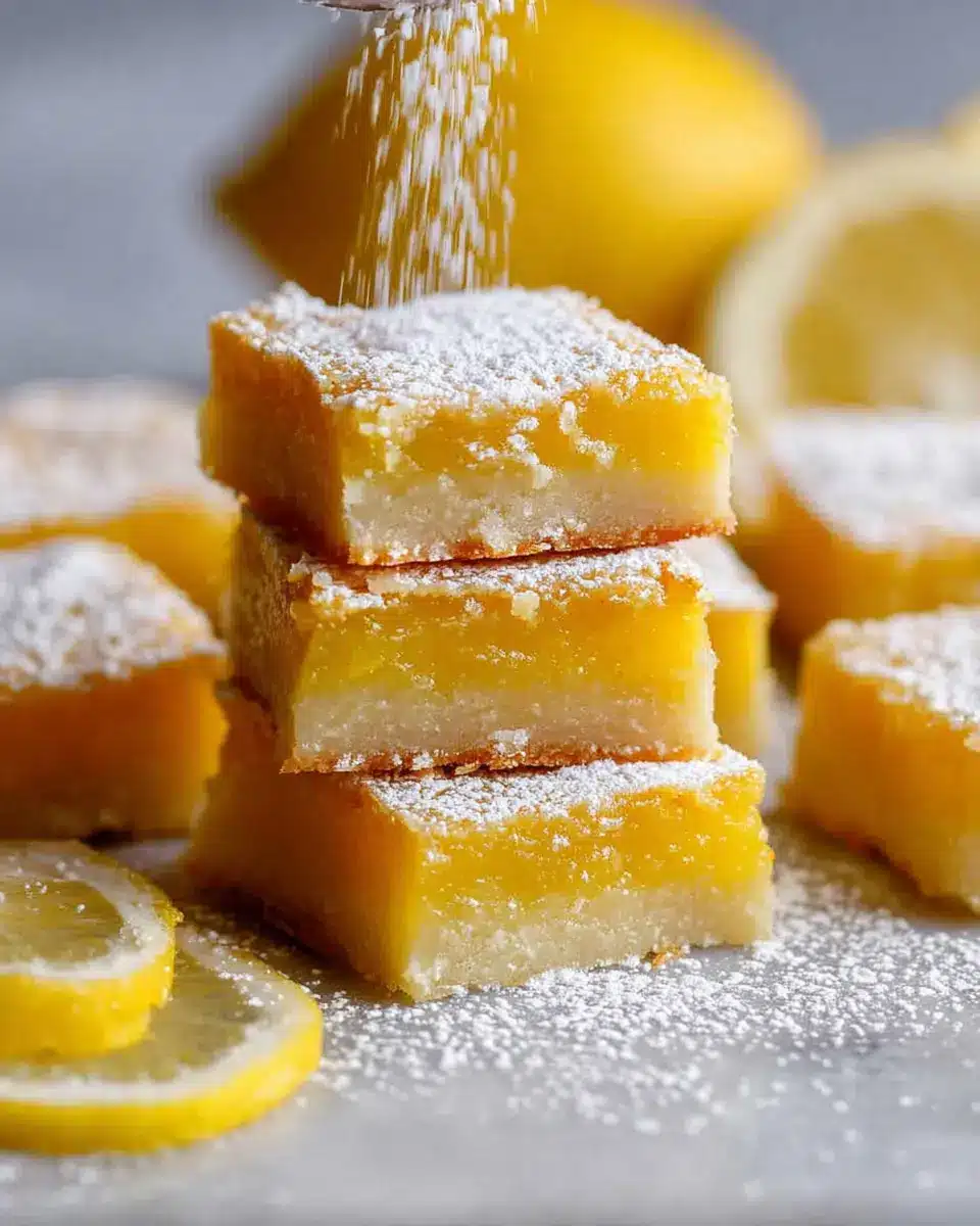 To make your easy lemon bars truly shine, consider serving them on a vibrant, colorful platter or cutting board. Dust the squares with a generous layer of icing sugar for a touch of elegance, and add a few lemon slices or zests for a fresh pop of color. Garnish each piece with a sprig of mint to elevate the presentation and refresh the palate.