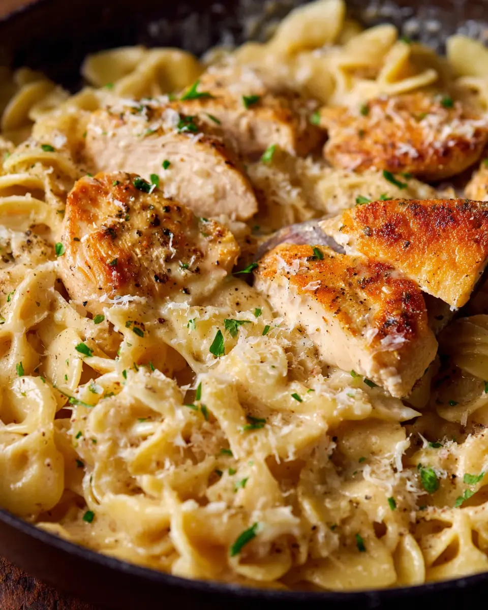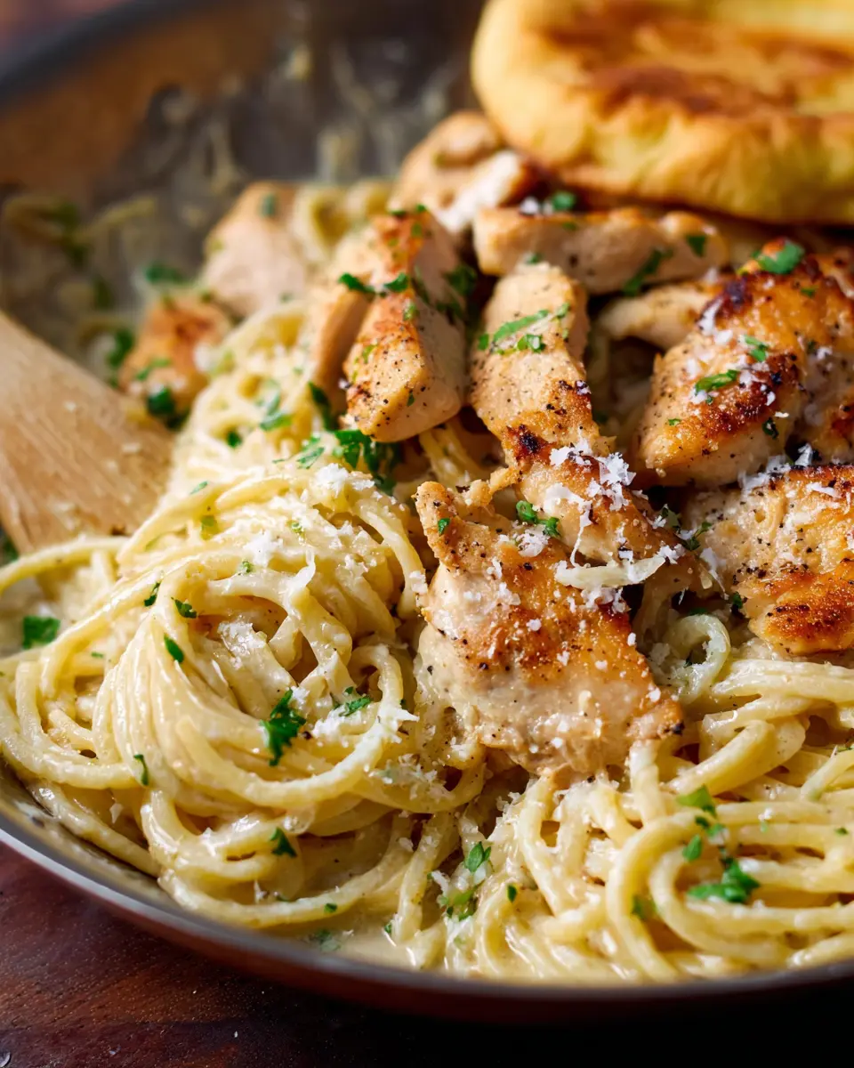 To make your pasta dish look as impressive as it tastes, serve it in large, shallow bowls. Twirl the pasta with tongs for an elegant swirl and place the chicken thoughtfully on top. Add a sprinkle of black pepper and a light drizzle of olive oil for an enticing sheen. Incorporate colorful cherry tomatoes or vibrant greens like arugula as a garnish for a pop of color that’s sure to impress at your next dinner gathering.