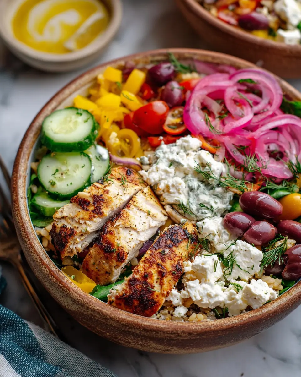 Enhance your Greek Chicken Bowls by serving them with a side of warm pita bread or fresh crusty bread. The bread is perfect for scooping up tzatziki and enjoying the vibrant flavors of the bowl. If you're looking for something lighter, a Greek salad loaded with crisp cucumber, juicy tomatoes, and Kalamata olives will complement the hearty dish beautifully.