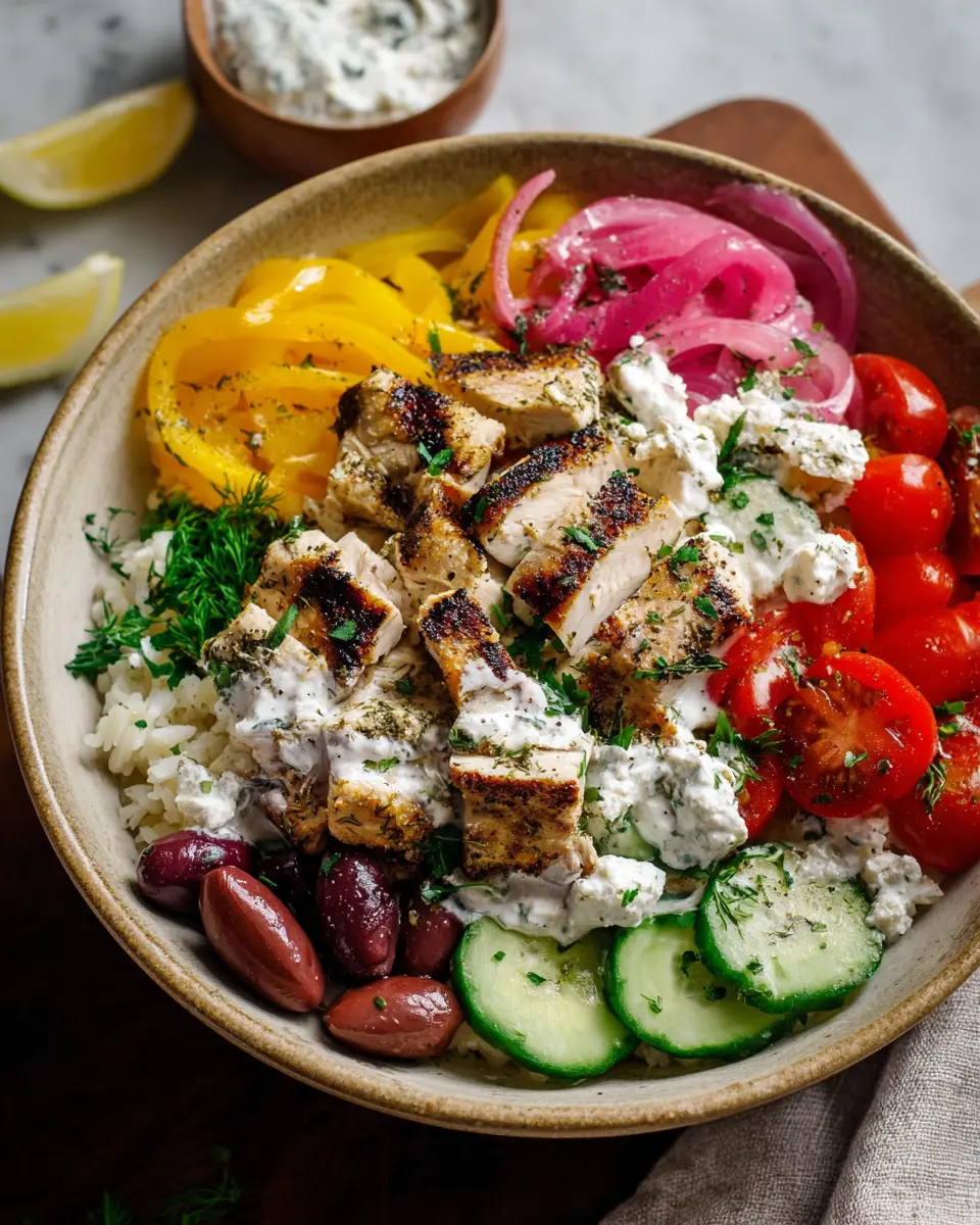 - Assemble the bowls: Add rice to a bowl, top with veggies, chicken (or chickpeas), olives, feta, and a dollop of tzatziki.