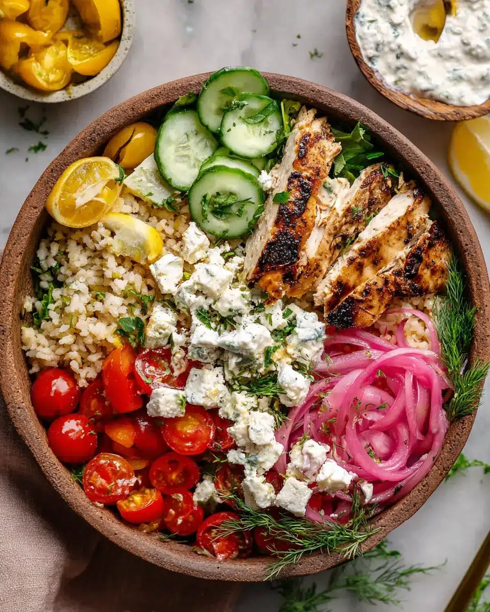 Now comes the fun part—building your Greek Chicken Bowls! Start with a generous scoop of your vibrant turmeric rice at the base. Top it with the sliced chicken or chickpeas, followed by the fresh veggies like halved cherry tomatoes and cucumber slices. Don’t forget your pickled red onions or thinly sliced red onion to add a zing!