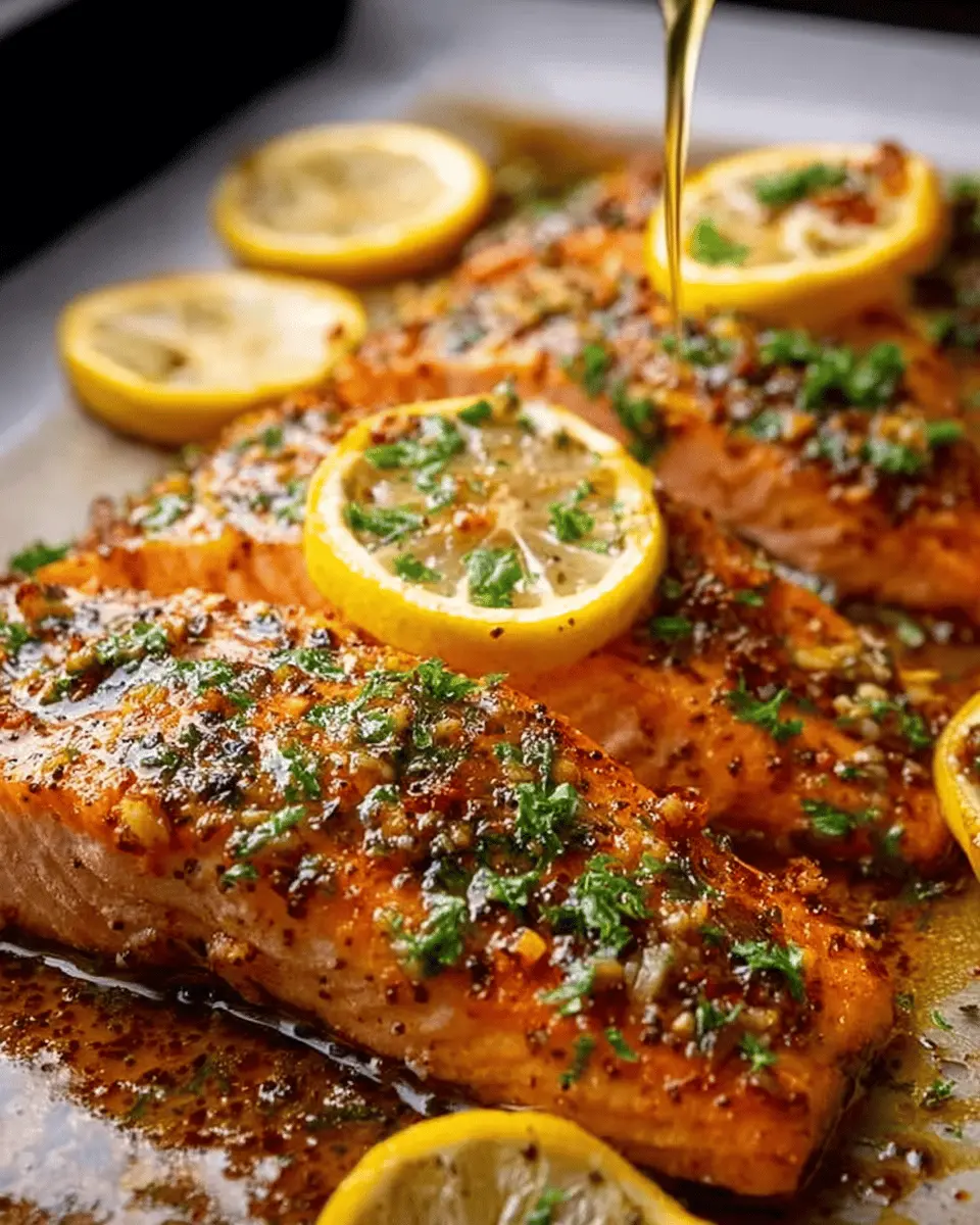 Place the salmon fillets skin-side down on your lined baking tray. Pour the honey garlic butter sauce generously over the fillets. Don’t worry if the sauce pools on the tray; that’s part of the magic! Arrange the lemon wedges around the salmon, which will infuse a refreshing citrus flavor as it bakes.