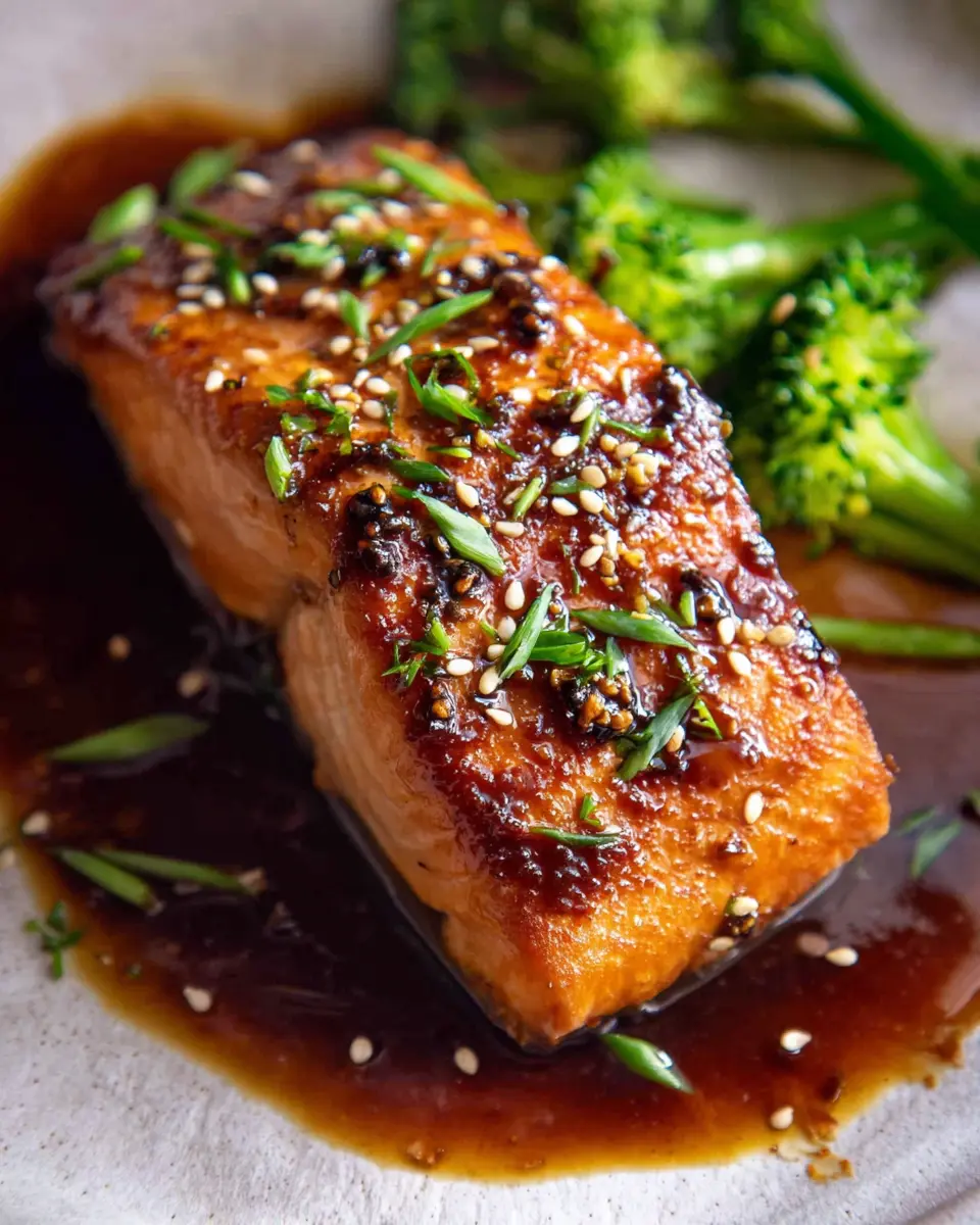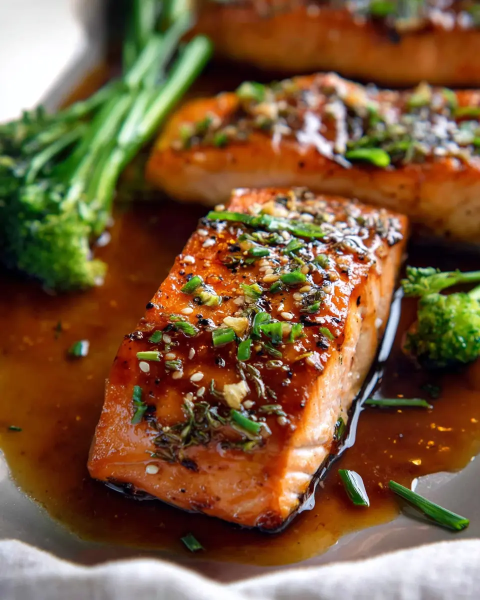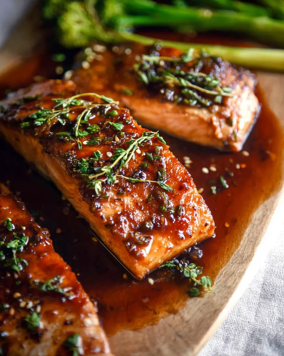 Elevate your presentation by placing the salmon on a bed of quinoa or rice, drizzling the sauce artistically around the plate. Garnish with a sprinkle of sesame seeds and finely sliced chives for that perfect touch. Create height on your plate by stacking veggies on one side, giving depth to your dish. For an extra special touch, serve on a wooden board or slate, lending a rustic, gourmet feel.