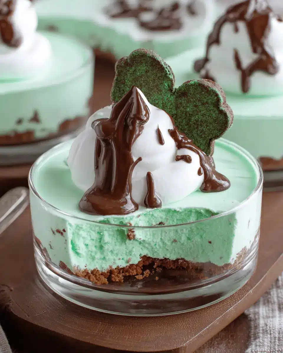 To finish off your shamrock cheesecakes in style, drizzle some mini chocolate chips on top. You can also add a dollop of Cool Whip for an extra creamy bite. For a whimsical twist, carefully position a mint chocolate chip shamrock marshmallow on top as a final garnish. This not only adds to the presentation but also makes each serving feel extra special.