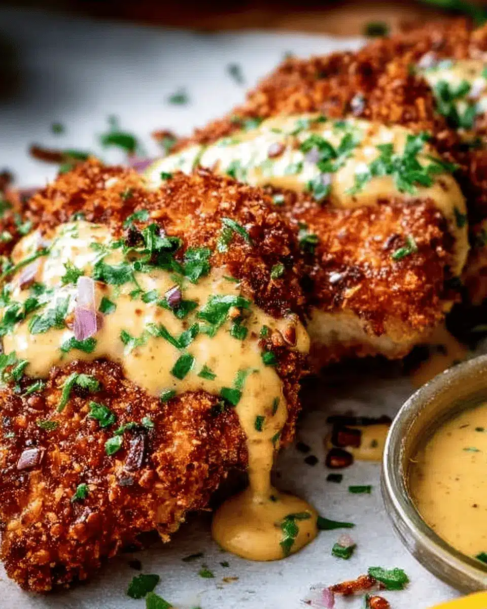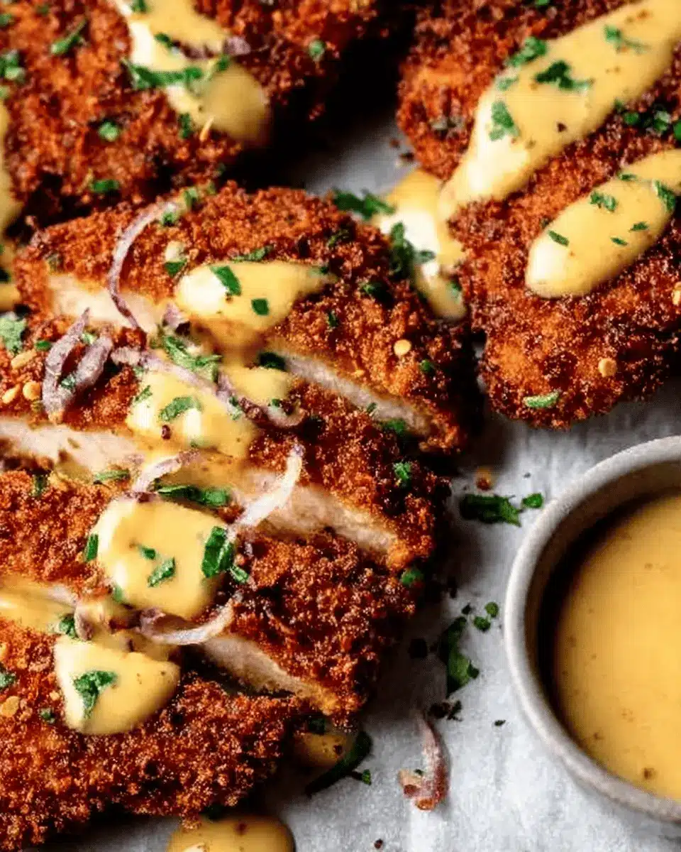 - Drizzle the sauce: Generously spoon the cheddar-mustard sauce over the chicken.