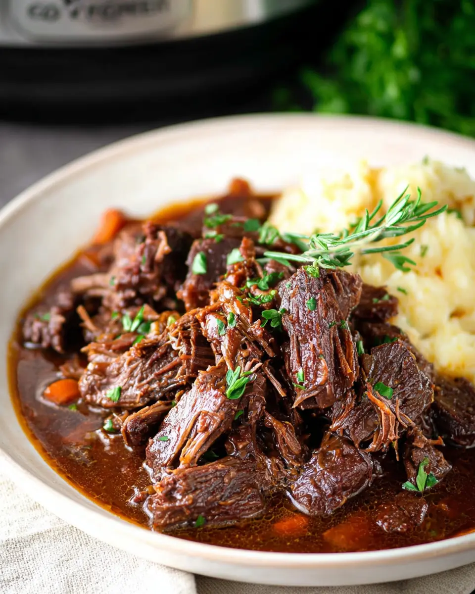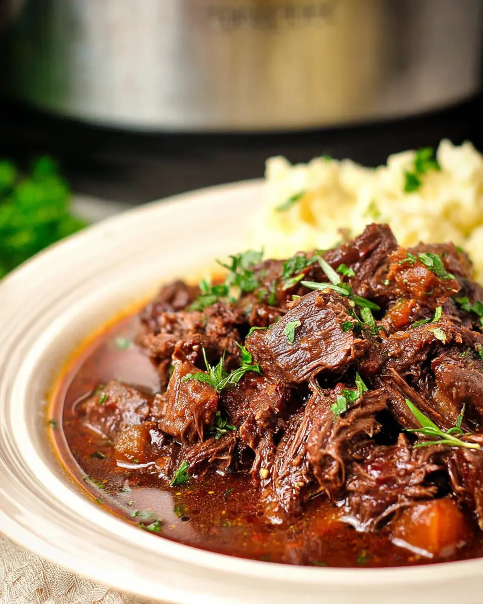 Once cooked to delicious perfection, take two forks and shred the beef right inside the slow cooker. As you pull apart the beef, it should fall away effortlessly, soaking up all those wonderful juices.