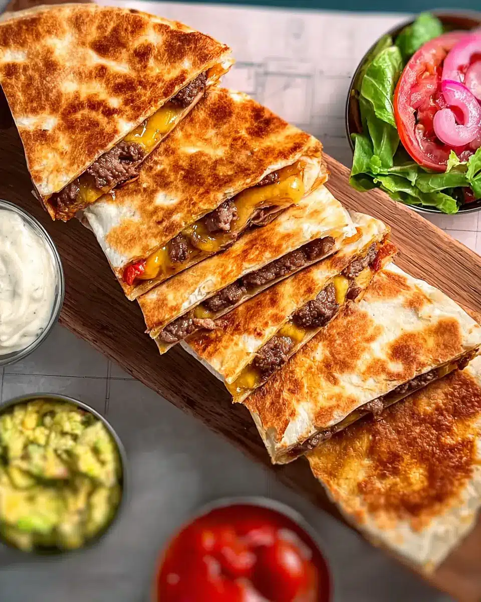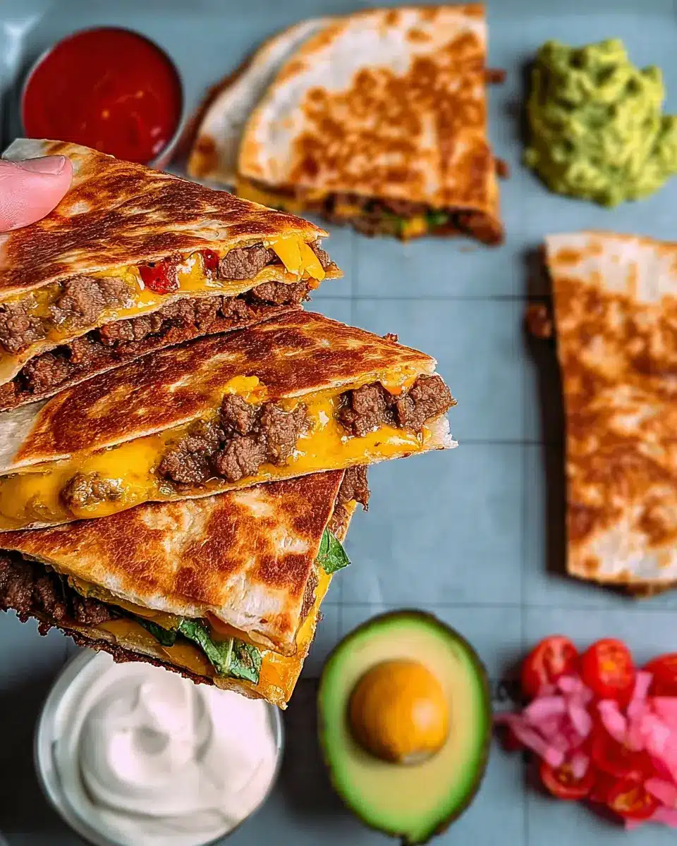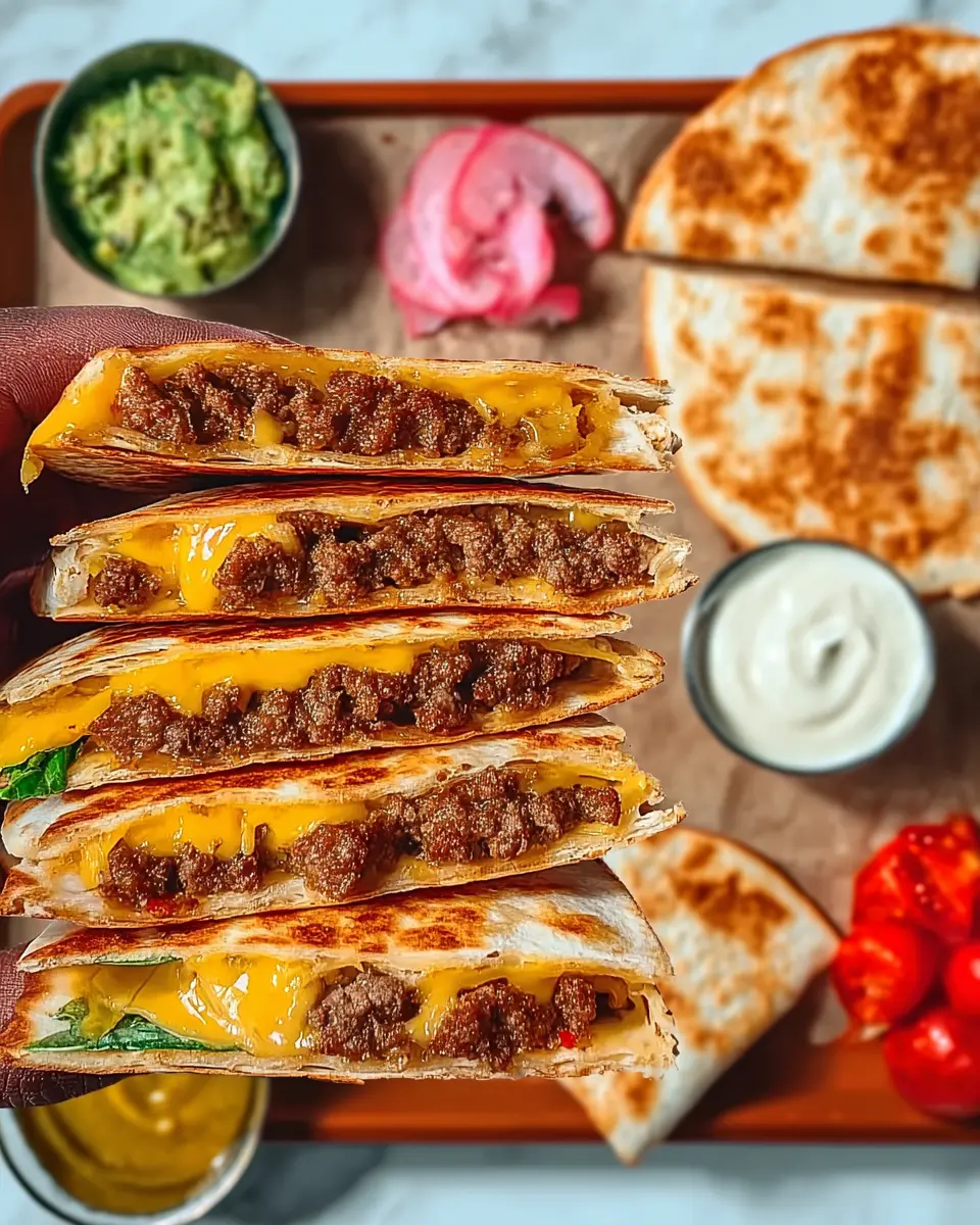 Imagine sinking your teeth into a warm, cheesy quesadilla bursting with savory beef, topped with tangy pickles and a special sauce that perfectly ties it all together. Not only do they make for an indulgent dinner, but they're also great for game nights or gatherings with friends. Plus, they come together quickly – you can whip up this mouthwatering dish in just 25 minutes!